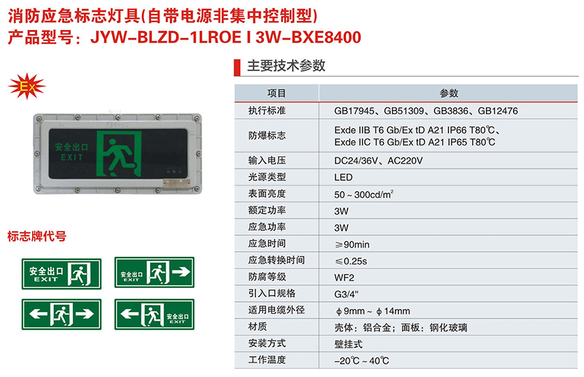 產品中心 防爆消防應急燈系列 JYW-BLZD-1LROE I 3W-BXE8400系列消防應急標志燈具